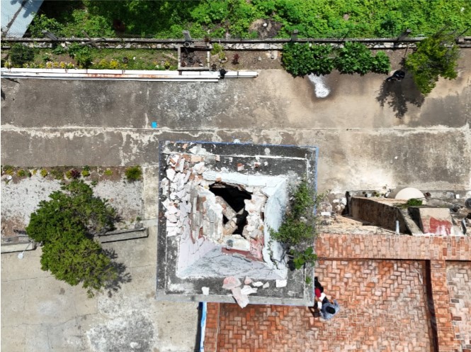 La lluvia torrencial dañó el remate de la torre y destruyó parte del chapitel de ladrillo, lo que derivó en el colapso de restos de dicho elemento al suelo y en la apertura de un hueco en la cubierta del campanario. Asimismo, se presentaron grietas y fisuras en la estructura de mampostería del primer y el segundo cuerpo de la torre, y sobre los vanos de sus arcos.