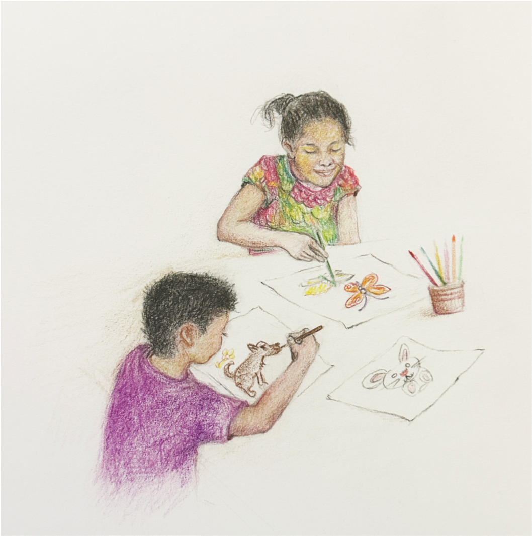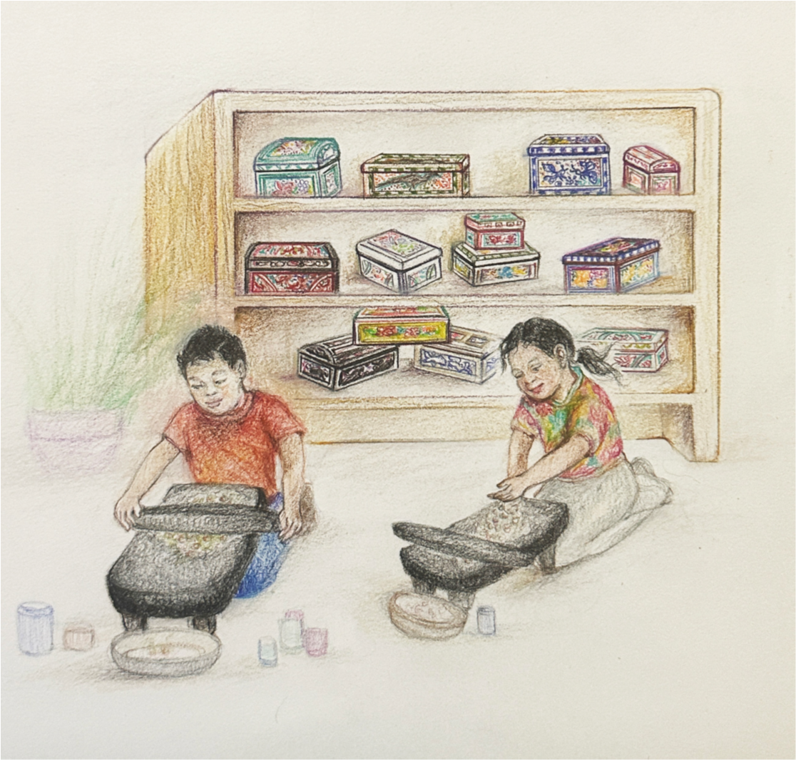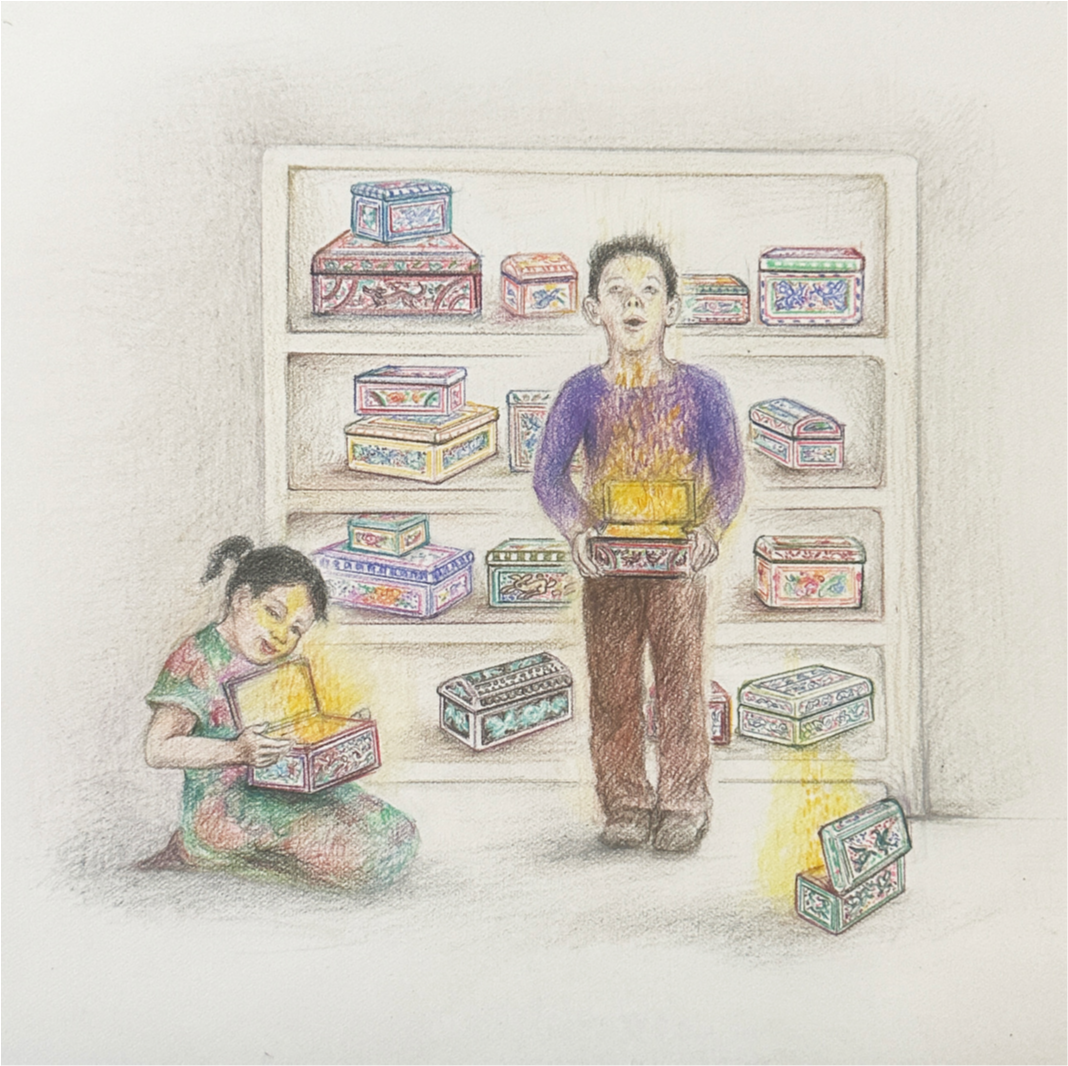 Xóchitl y Nachito enfrentan el desafío de preservar la tradición cuando su Tata ya no pueda hacer las cajitas de Olinalá. Ilustraciones del libro El tesoro de mi abuelo