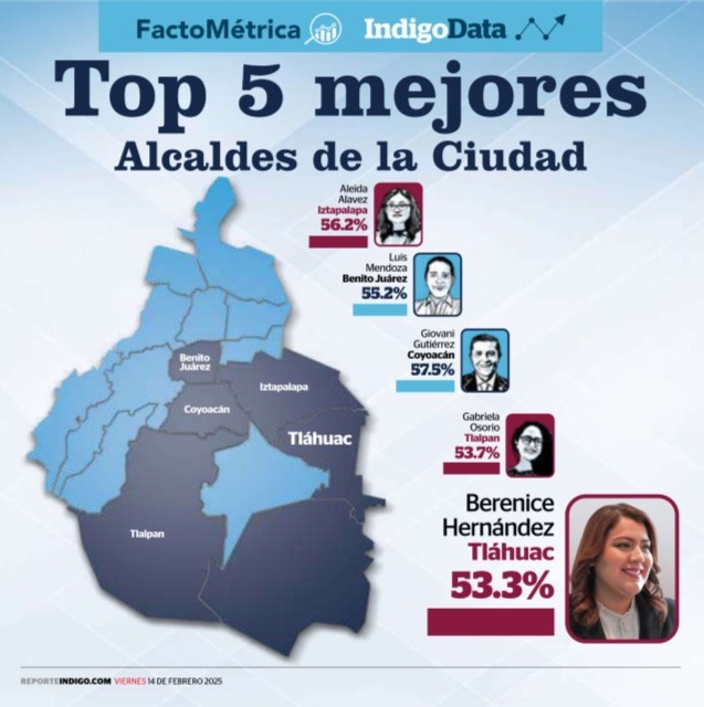 La alcaldesa de Tláhuac, Berenice Hernández, se mantiene en el top 5 de los alcaldes de la Ciudad de México mejor evaluados por su trabajo, de acuerdo con los resultados del ranking de Monitor Capitalino de la empresa FactoMétrica, al ubicarse en la posición 5 con 53.3% de aprobación.