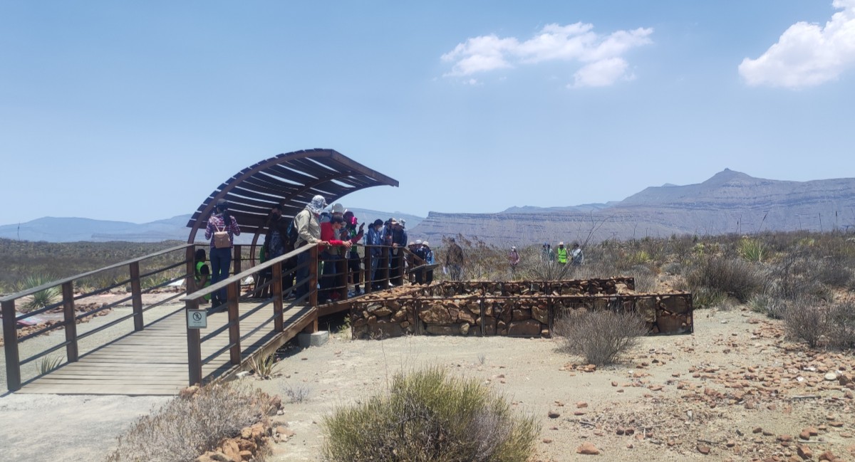 Fotografía izquierda, recorrido por la zona paleontológica (2024), tomada por Edgar Lujano; fotografía del centro, visita guiada en 2021, tomada por Fátima Garza, y una visita escolar de alumnos de preparatoria, fotografía tomada por Felisa Aguilar