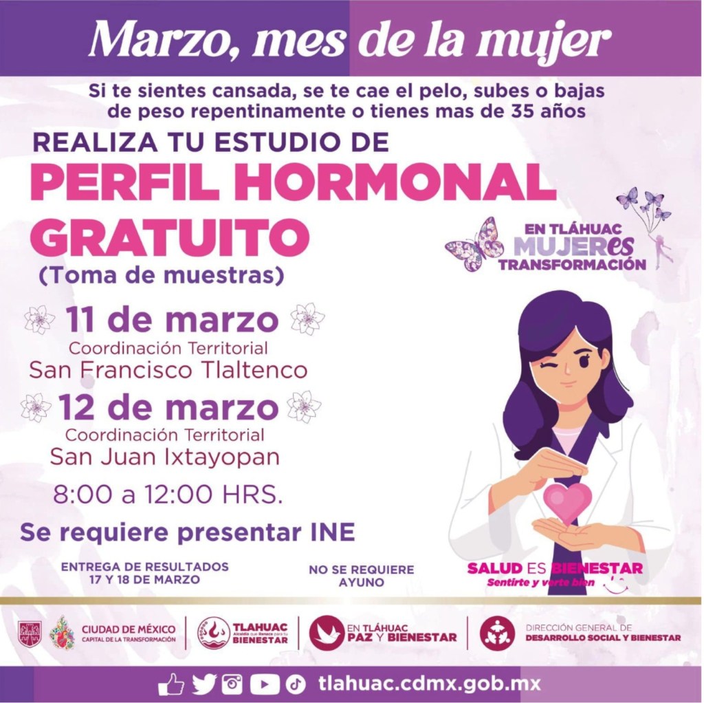 Estudios de Perfil Hormonal gratuito serán realizados a mujeres los días 11 y 12 de marzo en las Coordinaciones Territoriales de San Francisco Tlaltenco y San Juan Ixtayopan, respectivamente, a partir de las 8 de la mañana y hasta las 12 horas del mediodía, como parte del programa conmemorativo de Marzo, Mes de la Mujer, Mujeres Transformación, que lleva a cabo la Alcaldía Tláhuac, a cuyo frente se encuentra Berenice Hernández.