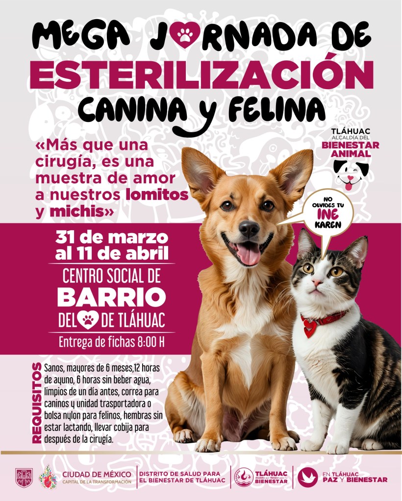 La administración local en Tláhuac, encabezada por Berenice Hernández, ratifica su compromiso por dignificar la vida de los animales de compañía con la Mega Campaña de Esterilización gratuita para perros y gatos, la cual se llevará a cabo del 31 de marzo al 11 de abril en el Centro Social de Barrio de San Pedro Tláhuac.