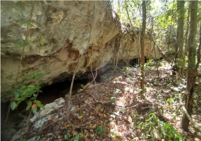 La entrada al sitio del descubrimiento presenta un espacio amplio, con columnas –espeleotemas creados a partir de la unión de estalagmitas y estalactitas– de tamaños diversos; pudo observarse que algunos de estos elementos naturales fueron delimitados en épocas antiguas por muros semicirculares de piedras.
