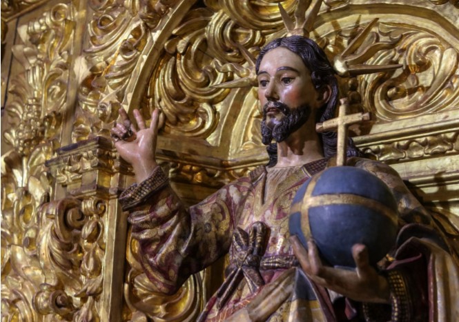 Un nivel más arriba, se dieron los últimos retoques a las vestimentas de los arcángeles Miguel, Rafael y Gabriel, al igual que a las esculturas de Jesucristo, el Espíritu Santo y Dios Padre, que aparecen de forma ascendente en la calle central del retablo.