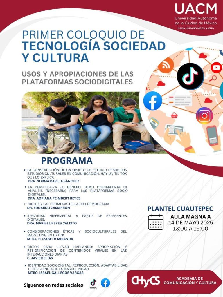 Este coloquio busca generar un espacio de reflexión y análisis sobre las prácticas, retos y oportunidades que surgen del uso cotidiano de las plataformas socio digitales, así como sus implicaciones culturales.