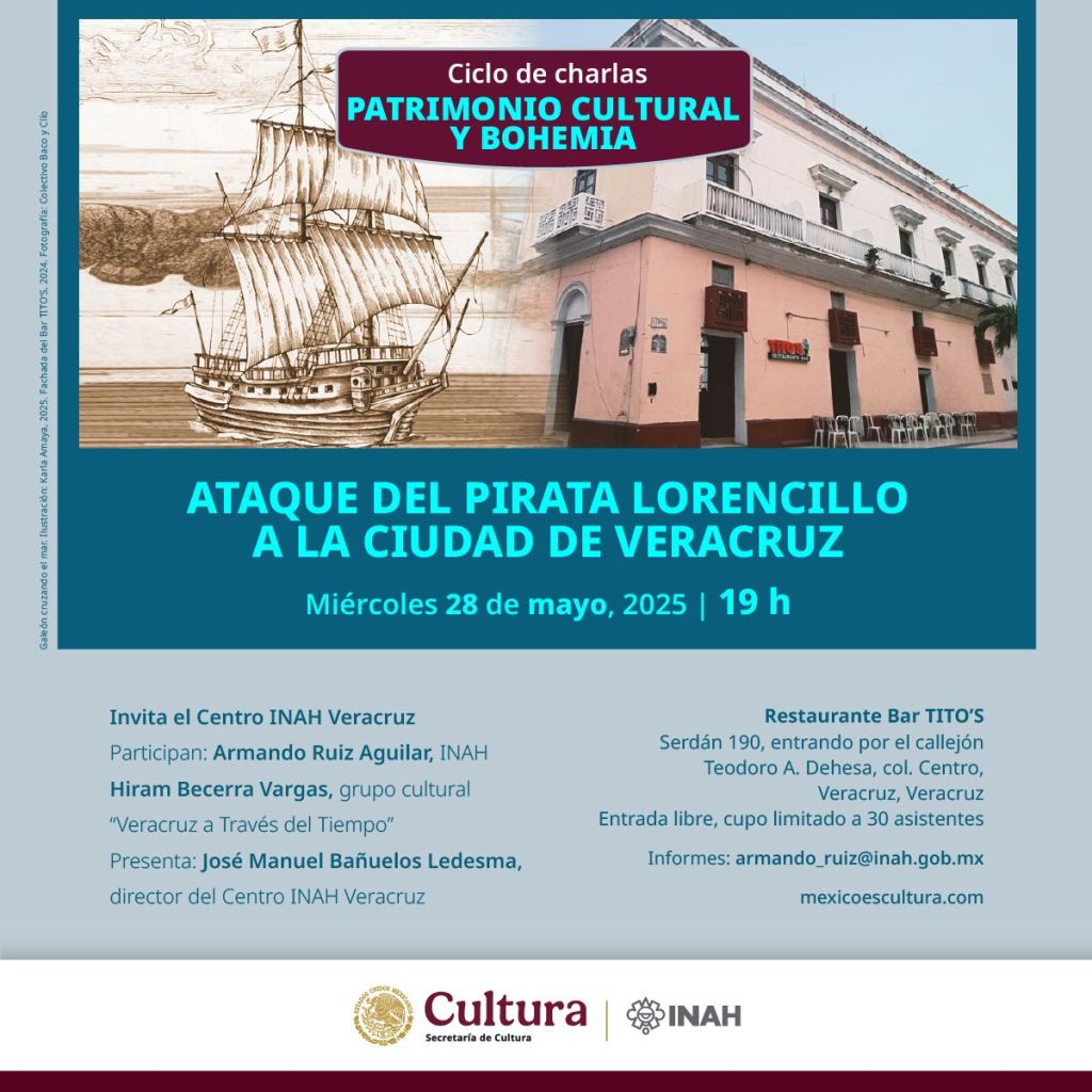 La más reciente charla fue la del «Ataque del pirata Lorencillo a la ciudad de Veracruz», suceso ocurrido el 17 de mayo de 1683, cuando este filibustero de origen neerlandés asaltó la urbe, que se efectuó en el restaurante bar Tito’s, ubicado en calle Serdán No. 190. ♦