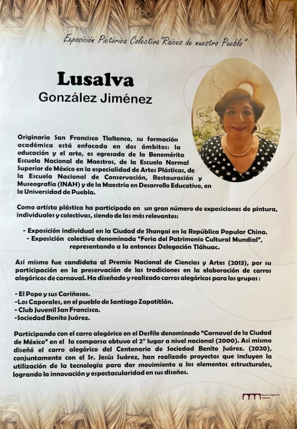 Lusalva, egresada de la Escuela Nacional de Maestros y también de la Escuela Nacional de Conservación, Restauración y Museografía del Instituto Nacional de Antropología e Historia, con una maestría en la Universidad de Puebla en Desarrollo Educativo, dijo que su obra «es de tipo costumbrista y refleja las tradiciones, así como la gastronomía de nuestros pueblos y, por supuesto, la tradición más importante de mi pueblo como es el carnaval», además de otros aspectos importantes de Tlaltenco».