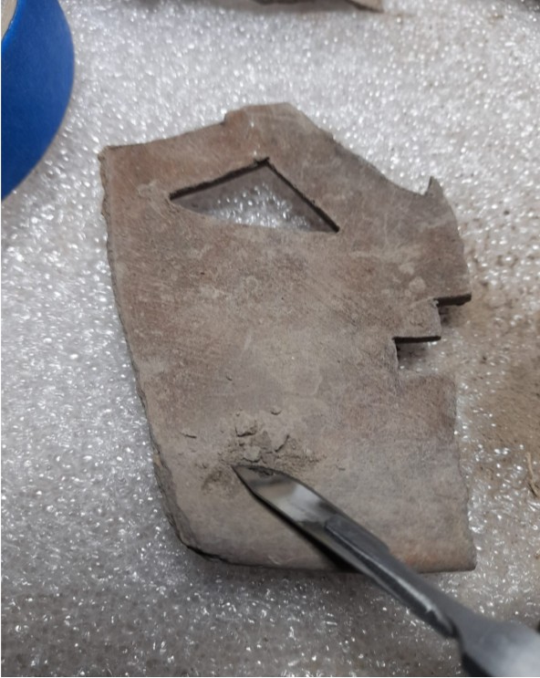 Así, 30 bolsas con fragmentos se trasladaron del Repositorio de Bienes Muebles al Taller de Restauración, donde con apoyo de estudiantes de Arqueología de la Universidad Autónoma del Estado de México, se avanzó en la identificación de cada fragmento para armar el rompecabezas de cada sahumador.