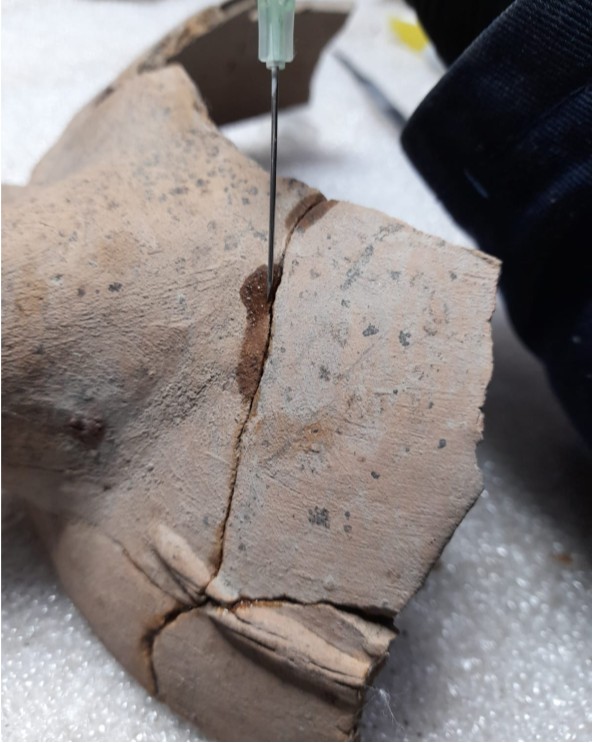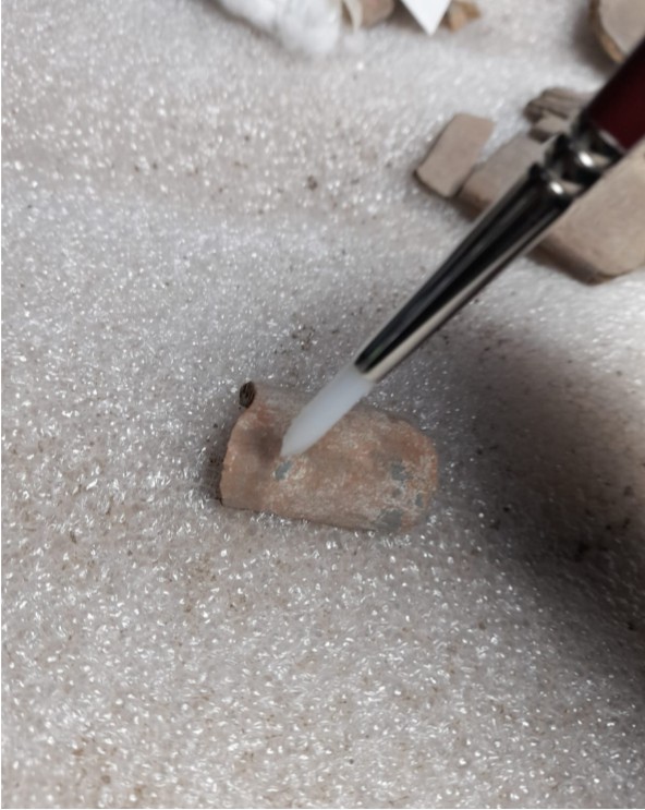 El restaurador indicó que la unión de los fragmentos se hizo definiendo el orden de cada uno para evitar deformaciones. Para ello, se utilizó un adhesivo compatible con los materiales originales y mantiene un comportamiento físico estable, ante alteraciones de temperatura y humedad.