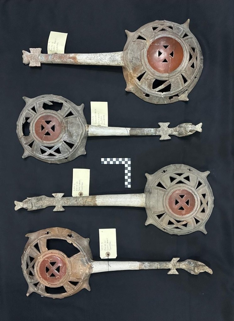 Moreno Zermeño explicó que la conformación de cada sahumador permitió observar que la colección incluye diferentes tipos. Su tamaño es diverso, las piezas más grandes varían entre 50-60 cm de longitud, y su cazoleta posee un diámetro de 40 cm; mientras, las más chicas miden entre 40-45 cm de largo, y su cazoleta, de 20 a 30 cm. Los remates serpentiformes de estas últimas no tienen pigmentación. También, destaca que uno de los cuencos sea liso, sin las acanaladuras que los caracterizan.