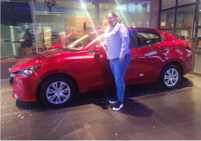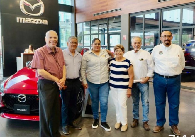 Alma Arévalo Maldonado, ganadora del Sorteo «Obsequio Entre Amigos 2025», recibió el flamante automóvil Mazda por parte de los integrantes de la mesa directiva de la AC~DIES8