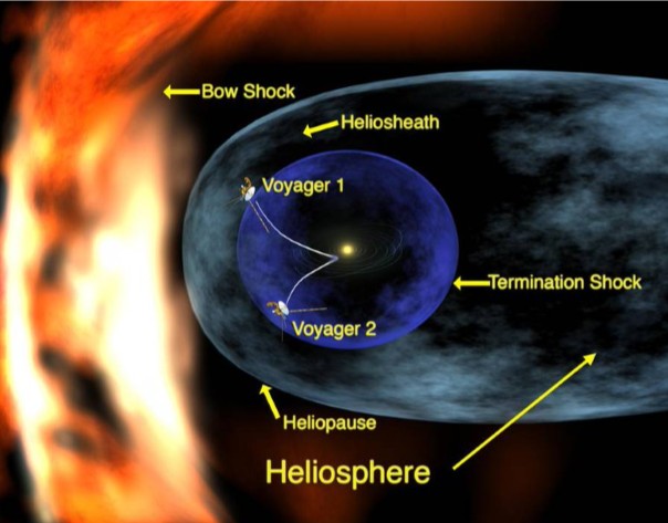 A decir de la NASA, «el Sol envía un flujo constante de partículas cargadas llamado viento solar, que finalmente viaja más allá de todos los planetas hasta unas tres veces la distancia a Plutón antes de ser impedido por el medio interestelar. Esto forma una burbuja gigante alrededor del Sol y sus planetas, conocida como heliosfera. El límite entre el viento solar y el viento interestelar es la heliopausa, donde la presión de ambos vientos está en equilibrio. Este equilibrio de presión hace que el viento solar retroceda y fluya por la cola de la heliosfera.