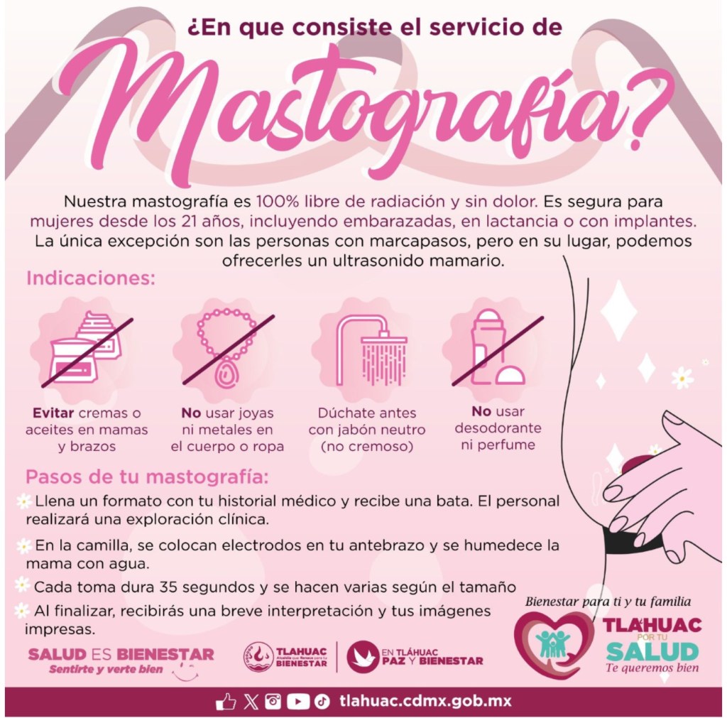La jornada de salud ofrece un servicio de mastografía 100% libre de radiación, no invasivo y sin dolor, adecuado incluso para mujeres embarazadas, en lactancia o con implantes mamarios. En el caso de personas con marcapasos, se ofrece un ultrasonido mamario como alternativa segura.