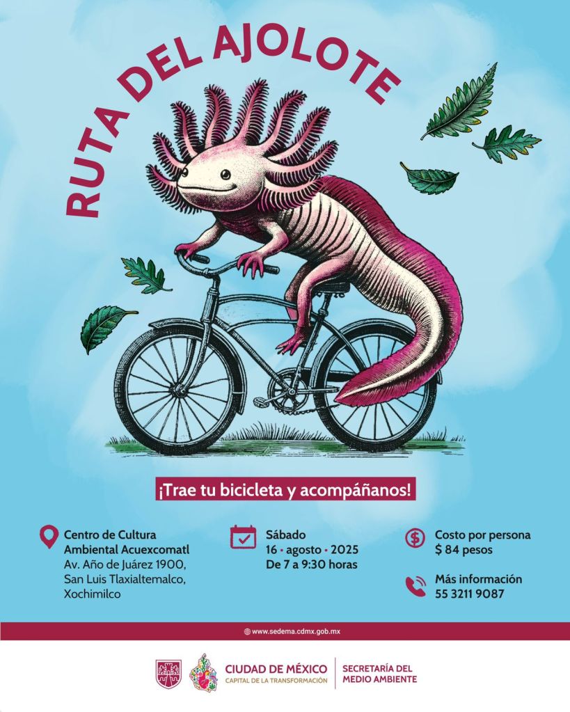 La rodada «Ruta del Ajolote» se llevará a cabo el próximo sábado 16 de agosto en horario de 7:00 a 9:30 horas, por lo que la Secretaría del Medio Ambiente (Sedema) de la Ciudad de México, a través de la Dirección General de Coordinación de Políticas y Cultura Ambiental, invita a la ciudadanía a participar en ésta.