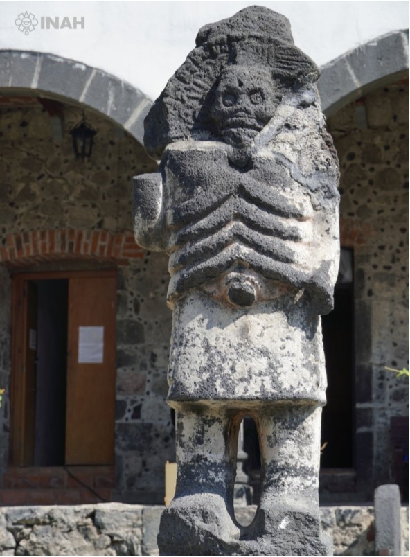La escultura se encuentra flanqueada por dos aros de juego de pelota, rito ceremonial en el que los guerreros capturados eran sacrificados en honor de la diosa de la vida y la muerte: Mixquixtli, cuya figura ocupa un lugar separado de los anteriores vestigios. Sobre una columna se sostiene y a sus pies se pueden ver cráneos y, más abajo, una representación de un entierro. Mide metro y medio de altura y tiene dos rostros, uno representaba la vida y, el otro, descarnado, la muerte. Tiene una cavidad poco más arriba de lo que es la cintura en la que se cree eran depositados los corazones de los guerreros sacrificados.