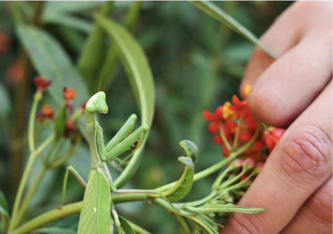 Por lo que toca a la fauna, Velasco Figueroa resalta la presencia de colibríes, mariposas nativas y Mantis religiosa. «Una de las sorpresas fue, sin duda, la mariposa monarca. Consultamos claves de identificación y estamos en contacto con especialistas de la UNAM y otros biólogos para cuidarla. El que esta especie migratoria haya dejado sus huevecillos nos habla de que las condiciones del huerto son las ideales».