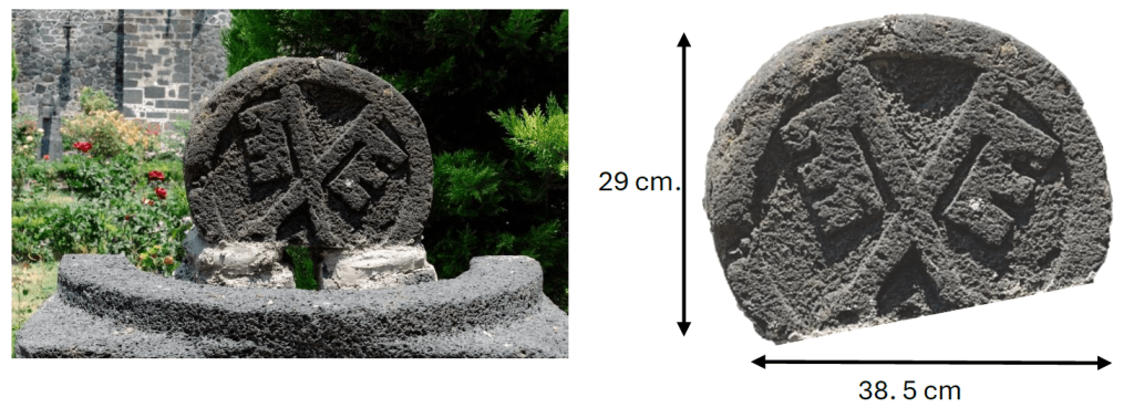 A saber, pareciera que el arquitecto que mandó labrar la piedra con el símbolo de la Santa Sede fue el mismo que realizó el mural, ya que fusionando y ajustando las imágenes, resulta que coinciden casi a la perfección. Cabe mencionar que en cuestiones geométricas y para el dibujo técnico, aunque se desconoce la razón de semejanza, tanto de las llaves apostólicas como de lo que sería la mitad de la cruz de San Andrés, son dos formas semejantes. Aún más, examinando a detalle la pintura, pareciera que el ojo o cabeza de la llave se une a uno de los brazos de la cruz; por ello, se podría decir que surge otro personaje, San pedro sosteniendo las «llaves apostólicas». En el mural, la Iglesia o la Santa Sede como la comunidad de los seguidores de Cristo, es representada por peces al interior de la corona circular. En el bloque de piedra, la corona sólo abarca un poco más del semicírculo, quizás no fue completada por las características de la roca (Figura 4).