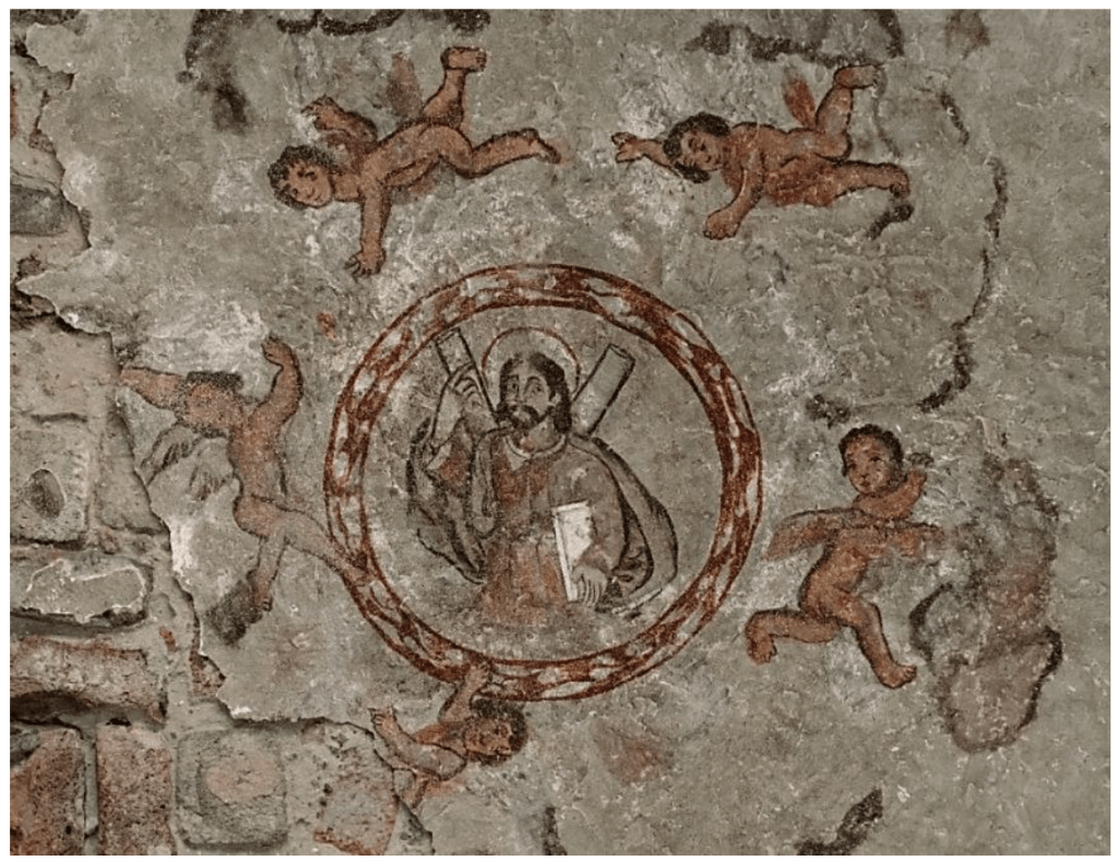 En lo alto de la bóveda claustral del campanario, ubicada en el primer cuerpo de este inmueble, se encuentra una pintura mural que nos refiere diversos conceptos iconográficos (Figura 3). Podría decirse que, dada la advocación al Apóstol Andrés, sería obvio que este personaje estuviera únicamente representado en el lugar. Sin embargo, tenemos que mencionar que el artífice de este mural remite diversos mensajes en torno al personaje central, ya que examinando a detalle la pintura, sus atributos y particularidades no del todo le corresponden al Apóstol mencionado, pues a él se le representa como un anciano, casi desnudo, cargando su cruz aspada o teniéndola a un lado, eso sí, fue el primero en ser llamado por Jesús (Cabral Pérez, 1995: 271). Debido a ello, podemos insinuar que no se trata de uno, sino varios personajes a la vez. Enseguida desglosaremos los atributos de esta pintura mural.