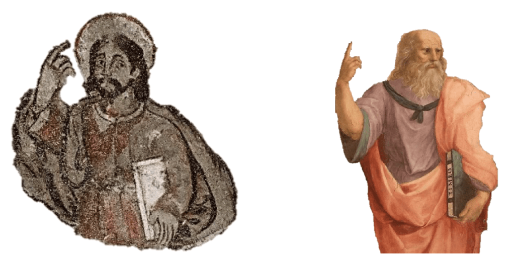 Al mismo tiempo, cuando se quita todo y únicamente se deja al personaje central, pareciera remitirnos a un Cristo pantocrátor a un «Todo Poderoso”, en el que los dedos de su mano derecha formarían el signo IC XC, que significa «Bendecido en el nombre de Jesús». Incluso, el protagonista pareciera haber sido realizado bajo los cánones de belleza establecidos durante el Renacimiento, pues existe demasiada semejanza con el filósofo griego Platón; la diferencia de éste es que su dedo índice de la mano derecha apunta al cielo, además que es uno de los dos personajes centrales de «La Escuela de Atenas» del pintor Rafael Sanzio (1483-1520) (Figura 5).