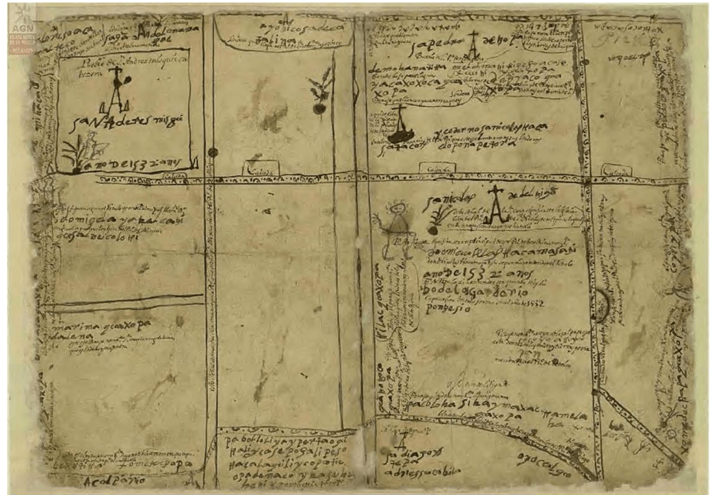 Con respecto a la praxis de la marca de fuego, es importante señalar que se definía como una señal carbonizada colocada principalmente en los cantos de los libros mediante un instrumento metálico candente. Cabe mencionar que dicha práctica se encontró acogida en las bibliotecas conventuales y en instituciones religiosas dependientes del clero secular (Marcas de fuego, 2015). No obstante, es necesario mencionar que, aunque no propiamente se utilizó como una marca de fuego, la letra «A», correspondiente a la Orden de San Agustín, se empleó también en documentos, tal es el caso del mapa de San Andrés Mixquic del año 1532. Los lugares donde está colocada la inicial «A» representan una Iglesia o capilla y son San Andrés Mixquic, Ayotzingo, San Pedro Tezompa y San Nicolás de Tetelzingo. Los tres restantes no los he podido transcribir dadas las condiciones del documento. Debe mencionarse que todos estos lugares son circunvecinos a la comunidad de Mixquic.