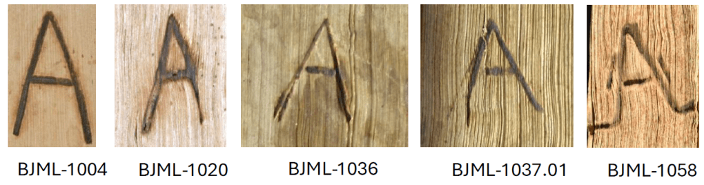 Sirva de ejemplo, la sigla «A», inicial de la Orden de San Agustín y marca de fuego en algunos ejemplares que se encuentran digitalizados en el Catálogo Colectivo de Marcas de Fuego de la Benemérita Universidad Autónoma de Puebla (Marcas de fuego, 2015) (Véase Figura 7).