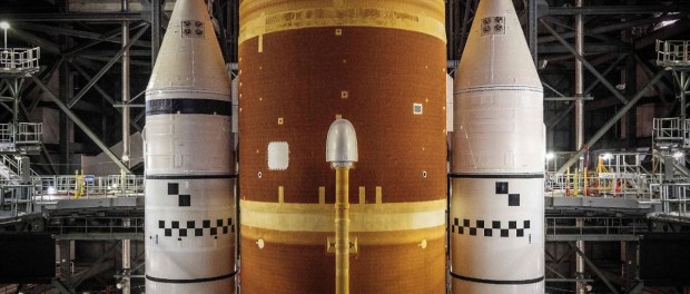 El cohete, de 98 metros (322 pies) comenzó su descenso a 1.6 km/h (1 mph) desde el Edificio de Ensamblaje de Vehículos del Centro Espacial Kennedy al amanecer. El trayecto de 6 km duró hasta el anochecer, en el Sistema de Lanzamiento Espacial del edificio, construido en la década de 1960 para albergar los cohetes Saturno V que enviaron a 24 astronautas a la Luna durante el programa Apolo.