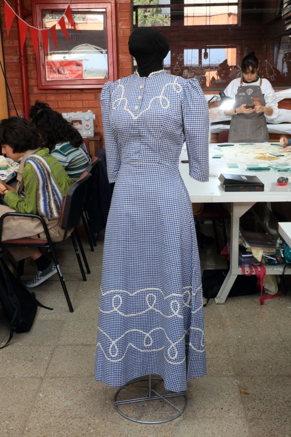 «El vestido –describe Julieta Ampudia–, está compuesto por la talla superior y la falda en corte A. Tiene tres botones de hueso, la espiga es de rayón y, conforme la identificación realizado por la bióloga Iraís Velasco Figueroa, la fibra del textil es celulosa; asimismo, mediante pruebas de cloroformo y ácido sulfúrico, se identificó que está teñido con añil y se le aplicó un apresto general de almidón».